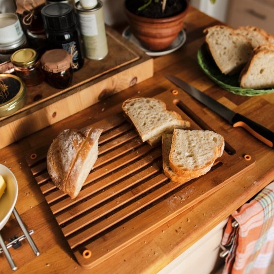 Profilowana bambusowa deska do krojenia posiada rowki na okruchy chleba oraz antypoślizgowe silikonowe nóżki