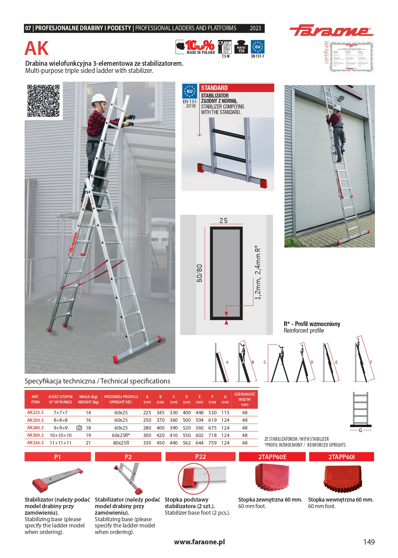 – Części drabiny zabezpieczono stopkami antypoślizgowymi i szerokim stabilizatorem zakładanym na dolny element.