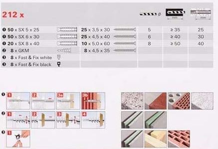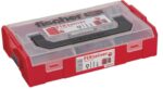 Zestaw fischer FIXtainer zawiera wstępnie posortowane 50 sztuk SX 5×25, 50 sztuk SX 6×30, 20 sztuk SX 8×40 oraz 25 pasujących śrub do płyt wiórowych 3,5×30 mm, 25 śrub do płyt wiórowych 4,5×40 mm, 10 śrub do płyt wiórowych 5×60 mm.