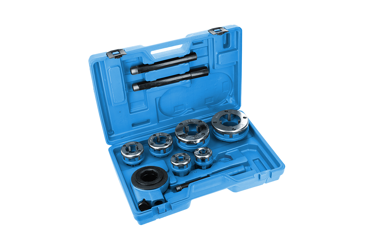Gwintownica ręczna do nacinania gwintów rurowych, umożliwia wykonywanie precyzyjnych połączeń gwintowanych, niezbędnych podczas prac remontowych, budowlanych i hydraulicznych.
