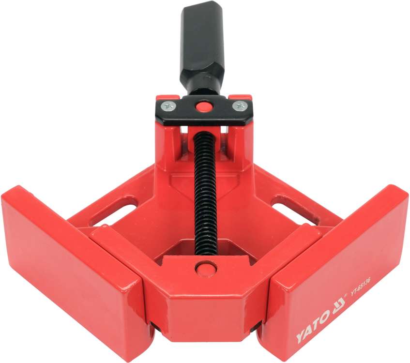Imadło kątowe do mocowania elementów pod kątem 90° . Korpus wykonany z aluminium podstawa 150 x 150 mm głębokość /grubość max. mocowanych elementów ok. 70 mm , wysokość zew. ścian ok 55 mm grubość ścian ok 13 mm w podstawie otwory do mocowania 10 mm x 32 mm . Śruba metalowa toczona fi 12mm umocowana w przegubie daje możliwość zmiany kąta mocowania poprzez docisk do jednej ściany , pokrętło plastikowe. do mocowania materiałów pod kątem 90 stopni. Najczęściej do wykonywania połączeń z listew lub desek.