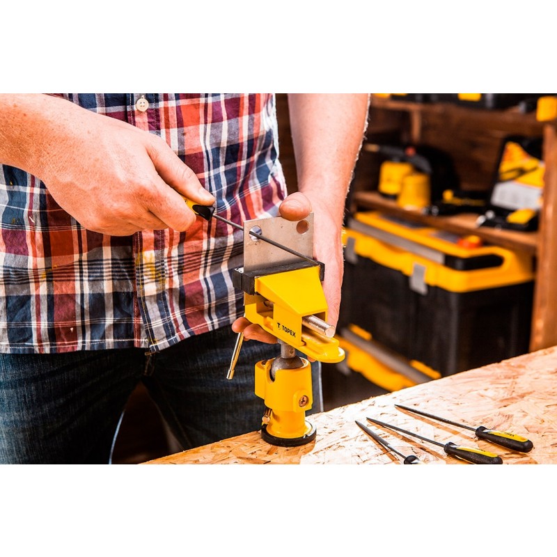 Imadło modelarskie TOPEX (nr ref. 07A307) o długości szczęk 75 mm. Przeznaczone do mocowania przedmiotów i materiałów podczas precyzyjnych prac. Dzięki wykonaniu z aluminium produkt jest odporny na korozję. Do wysokiego komfortu przyczynia się również system mocowania do blatu za pomocą ścisku oraz przegub umożliwiający ustawienie imadła pod odpowiednim kątem. Przycisk szybkiej blokady śruby mocującej umożliwia szybkie dosuwanie i odsuwanie szczęk bez kręcenia rękojeścią. Marka TOPEX skierowana jest do majsterkowiczów.