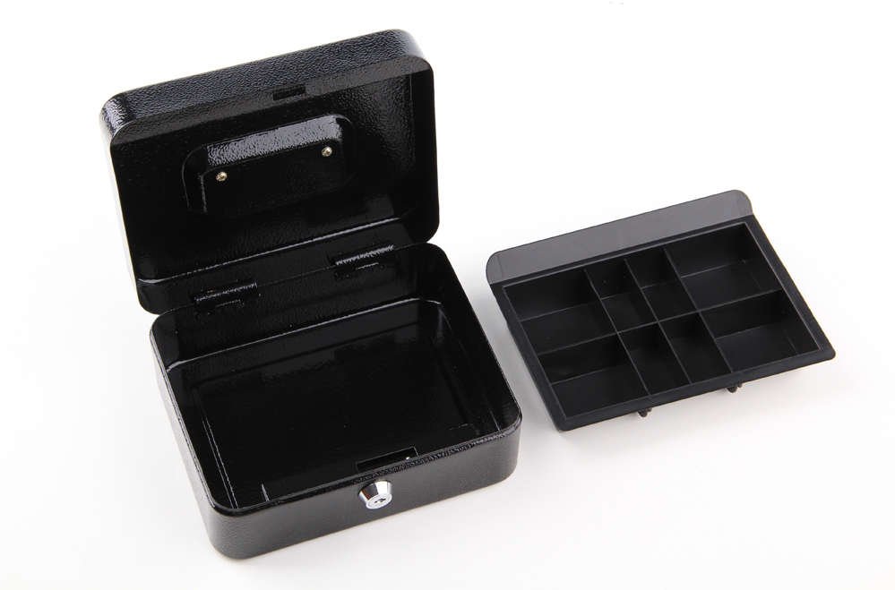 Przenośna kaseta na pieniądze o wymiarze 200x160x90mm. Wykonana z blachy stalowej o grubości 0,7mm, pomalowana w kolorze czarnym. Zamykana na zamek. W zestawie znajdują sie 2 klucze. Wewnątrz wyciągana wkładka na monety wykonana z tworzywa sztucznego.