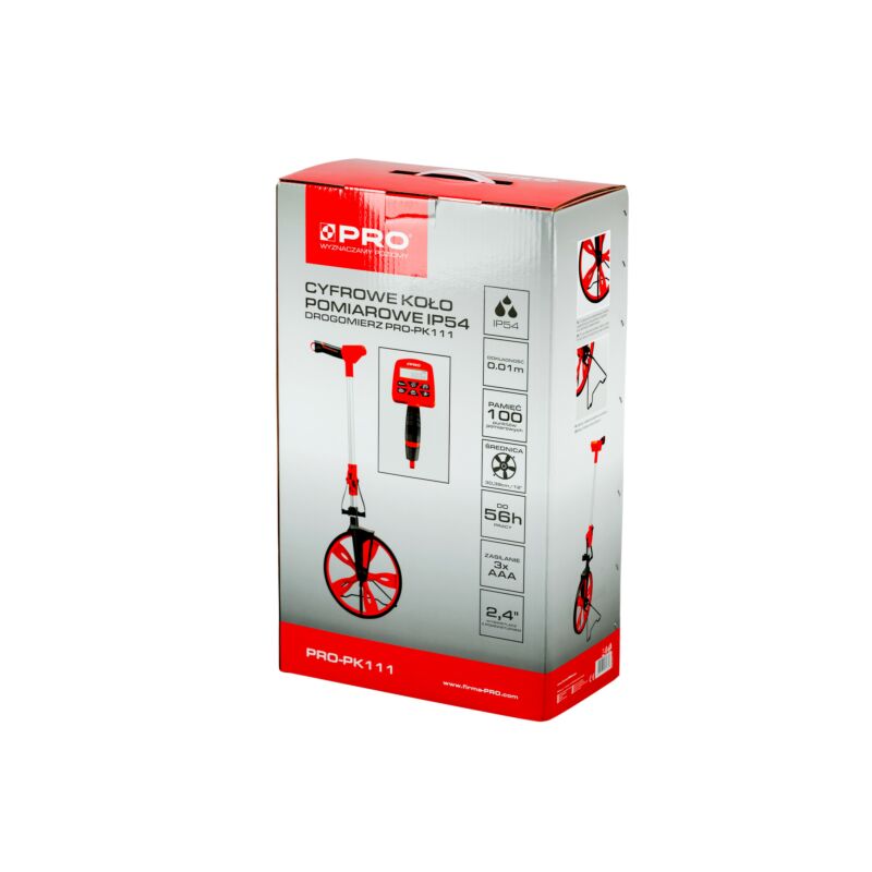 Zestaw zawiera: cyfrowe koło pomiarowe IP54, drogomierz PRO-KP111 3x baterie AAA, plecak
