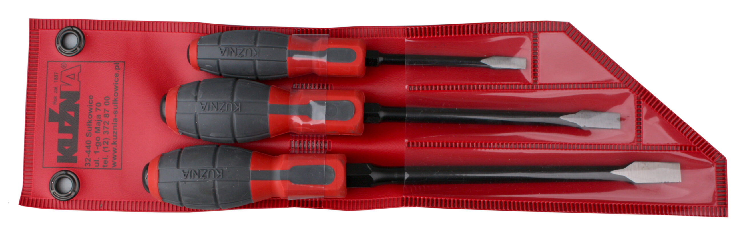 wykonane ze stali narzędziowej, powierzchnie czernione,rękojeść z tworzywa sztucznego, grot na całej długości rękojeścido pobijania, z 6-kątem do wspomagania pracy kluczem