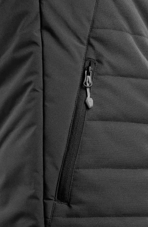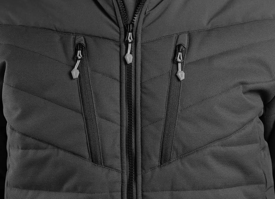 Kurtka jest wyposażona w kieszenie na piersi na zamek, boczne kieszenie na zamek, wewnętrzną kieszeń na piersi, delikatną elastyczną gumkę przy mankietach i dolnym obszyciu.