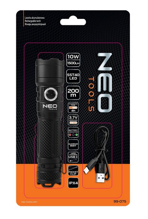 Latarka akumulatorowa USB C 1500 lm SST40 LED 99-075 marki NEO to poręczne urządzenie o mocy 10 W i 1500 lm. Oznaczenie światła ledowego SST40 wskazuje na dużą odporność na wstrząsy oraz warunki atmosferyczne. Latarka posiada akumulator litowo-jonowy 3,7 V 4000 mAh. Czas ładowania do pełna wynosi około 5 godzin. Urządzenie ma wbudowany wskaźnik postępu ładowania baterii. W pełni naładowana latarka umożliwia świecenie przez około 160 minut do nawet 9 godzin (w zależności od stopnia natężenia światła).