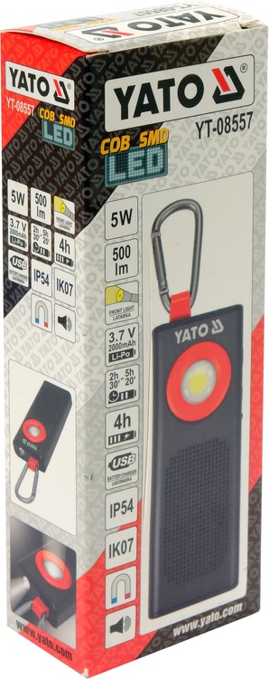Wytrzymała, aluminiowa latarka Yato wyposażona w diodę COB, która zapewnia światło o mocy 500lm i zasięg 28m. Trzy tryby pracy umożliwiają dostosowanie oświetlenia do wykonywanych czynności i poziomu naładowania baterii. Wyposażona w litowo-jonowy akumulator 3.7V 2000mAh zapewni do 5h i 20 minut pracy oraz umożliwia ładowanie innych urządzeń – funkcja powerbank. Urządzenie można połączyć np. z telefonem za pomocą bluetooth a następnie odtwarzać swoją ulubioną muzykę dzięki wysokiej jakości głośnikowi