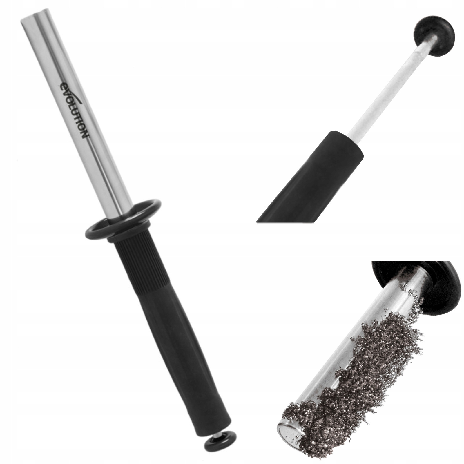 Przesuń magnetyczny drążek nad wiórami, aby je zebrać, następnie przenieś je nad pojemnik na wióry, wysuń tłok, a wióry odpadną automatycznie do pojemnika.