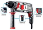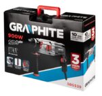 Młotowiertarka SDS+ 900 W, 3,4J, walizka 58G539 marki GRAPHITE to specjalistyczne narzędzie SDS+ o mocy 900 W, posiadające funkcje wiercenia oraz wiercenia z udarem pneumatycznym. Umożliwia wykonanie otworów do 28 mm średnicy w betonie i cegle, 13 mm w stali oraz 30 mm w drewnie. Narzędzie posiada funkcje zmiany kierunku obrotu wrzeciona, stopniowej regulacji prędkości i blokadę włącznika do pracy ciągłej. Podczas wiercenia młotowiertarka osiąga do 950 obrotów na minutę, a po przełączeniu na udar (funkcja udaru uruchamia się w trakcie docisku wiertła do powierzchni wierconej) – do 5300 uderzeń na minutę. Energia udaru w narzędziu wynosi 3,4 J. Wygodna funkcja ,,click” przeznaczona jest do szybkiego mocowania wiertła. Komfortowa rękojeść główna narzędzia pokryta jest antypoślizgową nakładką, dobrze więc leży w dłoni. W zestawie znajdują się: dodatkowe wiertła, uchwyt wiertarski, adapter do uchwytu, listwa ogranicznika głębokości wiercenia, obrotowa rękojeść dodatkowa, zasobnik ze smarem oraz walizka tra