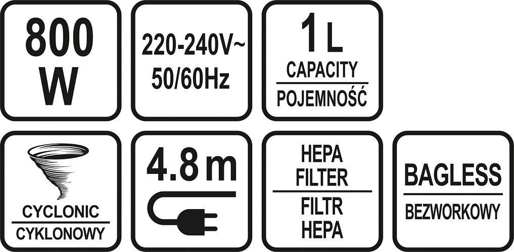Skuteczność – mocny silnik 800W oraz technologia cyklonowa gwarantują wysoką moc ssania a tym samym skuteczne odkurzanie