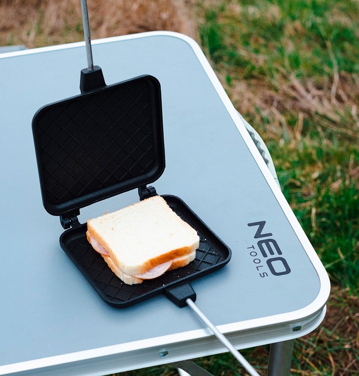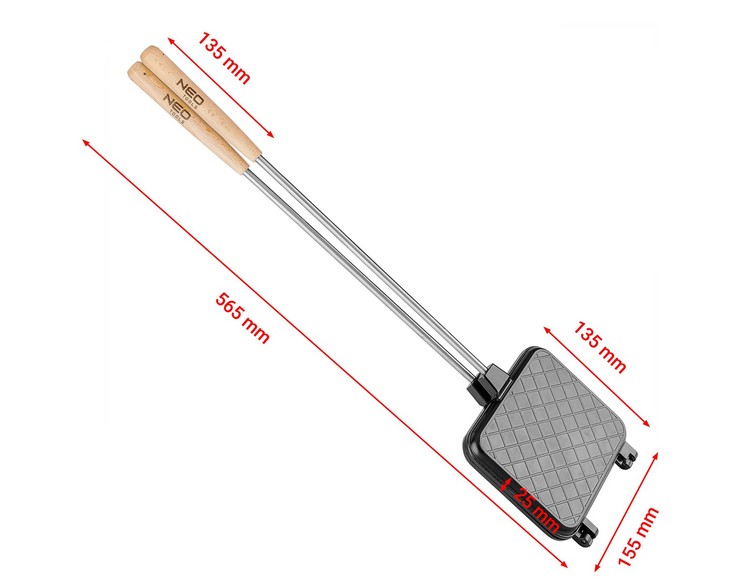 Opiekacz do kanapek na ognisko 63-156 marki NEO to produkt wykonany z aluminium anodyzowanego (forma), stali ocynkowanej (pręt) i drewnianych uchwytów.