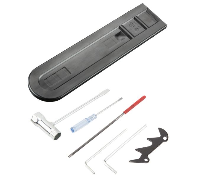 Do pilarki dołączona jest prowadnica wraz z osłoną, łańcuch, szpon przybory ze śrubami, wygodny pojemnik na mieszankę benzynowo-olejową, klucz do świec z wkrętakiem, wkrętak, klucz sześciokątny oraz pilnik.