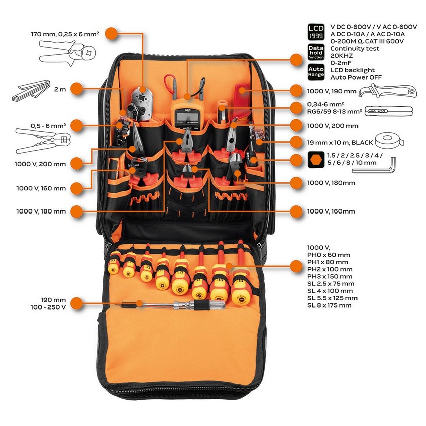 x 150 mm), oraz płaskie (SL2.5 x 75 mm, SL4 x 100 mm, SL5.5 x 125 mm, SL8 x 175 mm). W zestawie znajdziemy również próbnik o długości 190 mm i zakresie napięcia od 100 do 250V, czarną taśmę izolacyjną o szerokości 19 mm i długości 10 metrów, ściągacz izolacji o zakresie od 0.34 do 6 mm2, RG 6/59, 8-13 mm2, szczypce do zaciskania konektorów tulejkowych o długości 170 mm i zakresie od 0.25 do 6 mm2, miarę składaną o długości 2 metrów, nóż izolowany z płytką do rozpychania izolacji o długości 190 mm, a także klucze sześciokątne w 9 różnych rozmiarach (1.5, 2, 2.5, 3, 4, 5, 6, 8, 10 mm). Dodatkowo, w zestawie znajduje się ściągacz izolacji o zakresie od 0.5 do 6 mm2, miernik elektroniczny V DC o zakresie od 0 do 600V, V AC od 0 do 600V, A DC od 0 do 10A, A AC od 0 do 10mm, zakres Ohm od 0 do 200M?, kategoria bezpieczeństwa CAT III 600V, test ciągłości o częstotliwości 20KHZ, wyświetlacz podświetlany z zakresem od 0 do 1999, głośnik, zakres od 0 do 2mF, funkcja auto power OFF, oraz funkcja HOLD. Plecak elektryka ś