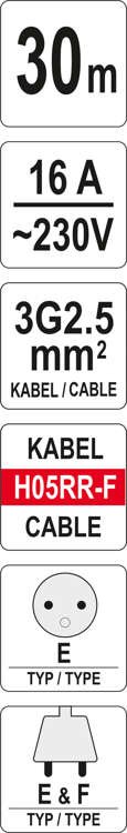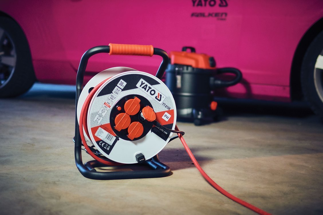 Profesjonalny przedłużacz przydatny w serwisach, warsztatach oraz na placach budowy. Wyposażony w metalowy stelaż, na który nawinięty jest gruby przewód o średnicy 10mm (3-żyłowy). Przewód posiada grubą gumową izolację. Na stelażu zamocowany jest gumowy uchwyt, który ułatwia transport.