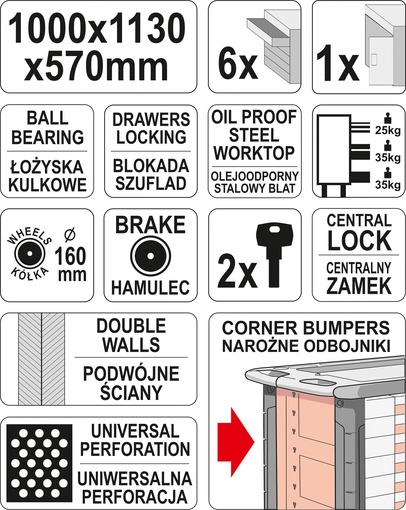 Cztery duże 160 mm gumowe koła zapewniają jej doskonałą kierowalność, a skuteczny hamulec sprawia, że szafkę można bezpiecznie ustawić w pożądanym miejscu.