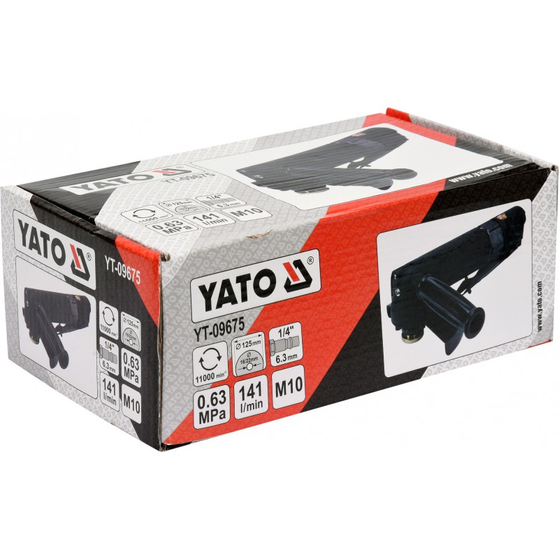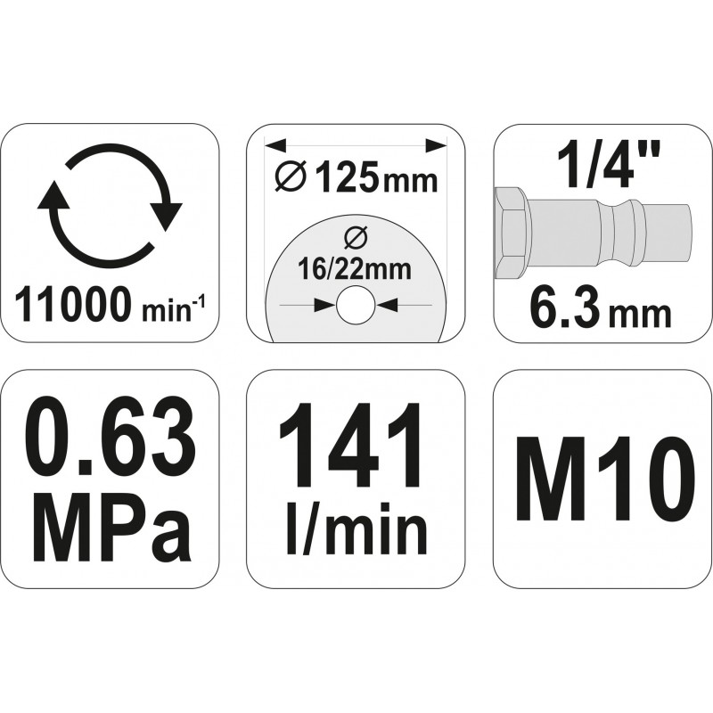 Profesjonalna szlifierka pneumatyczna kątowa. Dedykowana do tarcz o średnicy do 125mm. Charakteryzuje się niskim zużyciem powietrza wynoszącym 141 l/min oraz wysoką prędkością obrotową wynoszącą 11 000 obr/minutę. Przeznaczona do pracy w warunkach warsztatowych i przemysłowych.