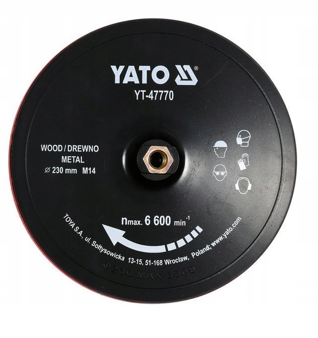 Tarcza do szlifowania powierzchni metalowych i drewnianych za pomocą mocowanych rzepów ściernych. Duża powierzchnia umożliwia uzyskanie równej płaszczyzny obrabianego elementu w szybkim czasie. Pasuje do dużych szlifierek kątowych z tarczą 230 mm i gwintem M14.