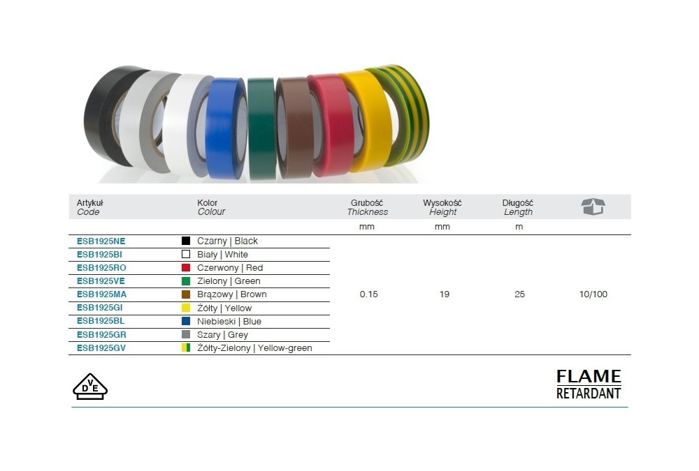 Taśmy elektroizolacyjne ESB1925 – szerokość 19mm, długość w rolce 25m, grubość 0,15mm