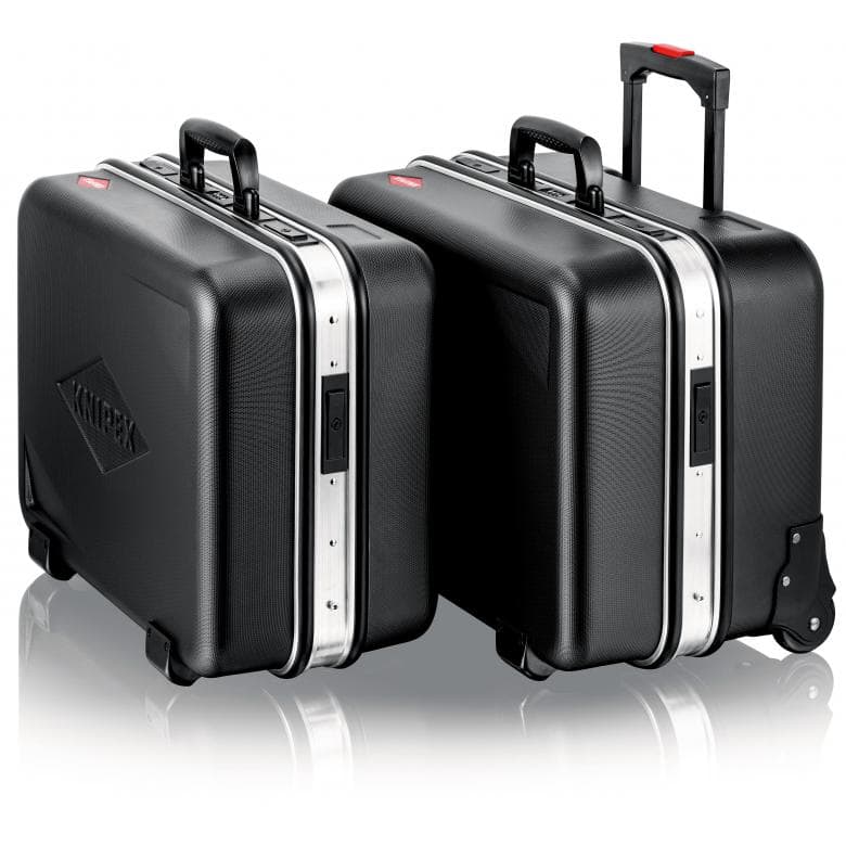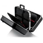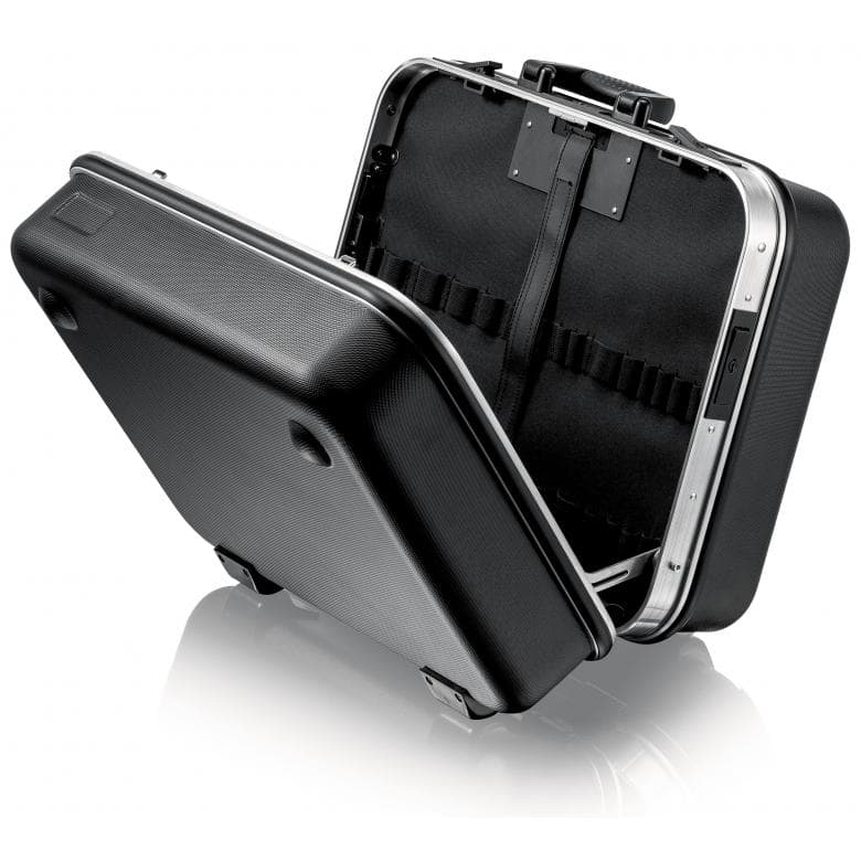 Rama aluminiowa po obwodzie z solidnie zamocowaną, stabilną ścianką środkową, którą można wyposażyć w narzędzia po obu stronach, z uniwersalnymi możliwościami uzupełniania wyposażenia walizki dzięki elastycznym uchwytom pętelkowym i dwunastu małym kieszonkom