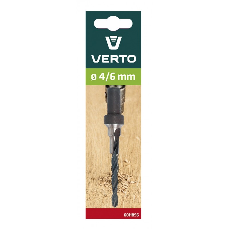 Wiertła do konfirmatów VERTO (nr ref. 60H896) o średnicy 4/6 mm, służące do precyzyjnego wiercenia w drewnie i płycie meblowej wielostopniowych otworów pod wkręty meblowe.
