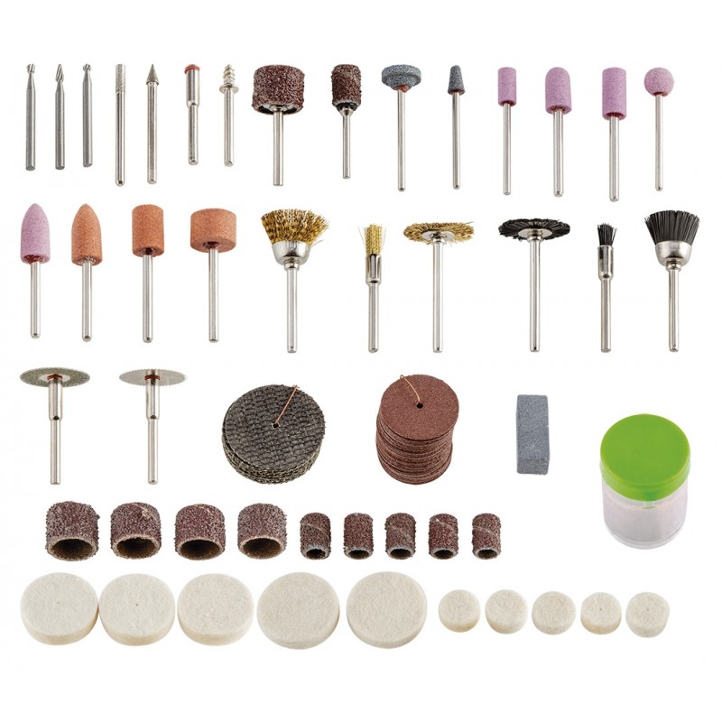 Akcesoria do miniwiertarki VERTO (nr ref. 50G029), zestaw 100 szt. zawiera komplet wierteł, tarcz tnących, ściernych, frezów i kamieni szlifierskich do stosowania z miniszlifierkami.