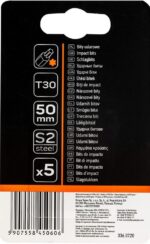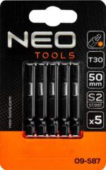 Bity udarowe NEO (nr ref. 09-587) to zestaw 5 profesjonalnych bitów udarowych typu T30 o długości 50 mm. Przeznaczone są do wkrętarek 1/4”. Posiadają system, który zabezpiecza je przed wyślizgnięciem się grota z wkręta. Bity wykonane zostały ze stali S2. Umożliwiają osiągnięcie wysokiego momentu dokręcania równego 21,8 Nm. System absorbcji momentu zabezpiecza końcówki przed szybkim zużywanie i znacznie przedłuża ich żywotność.