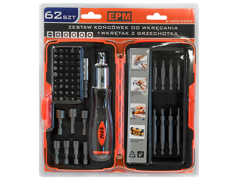 Zestaw końcówek do wkręcania + wkrętak z grzechotką 62szt