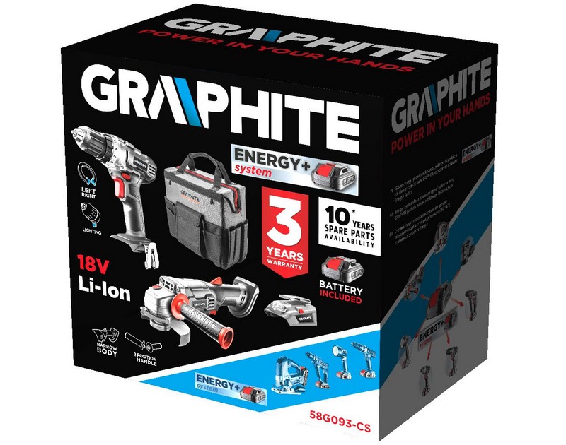 wiertarko-wkrętarkę (58G000), szlifierkę kątowę (58G003),adapter USB-latarka LED (58G025), akumulator Energy+ 2.0Ah (58G001), akumulator Energy + 4.0Ah (58G004) oraz ładowarkę do akumulatorów Energy+ (58G002) zapakowany w dużą torbe na kółkach z rączką Energy+ (58G0930).