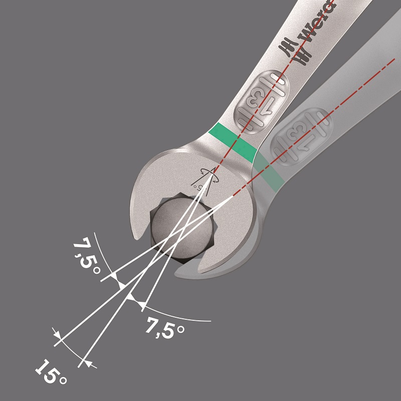 Smukła, a jednocześnie wytrzymała strona oczkowa klucza jest odchylona pod kątem 15° w stosunku do osi narzędzia.