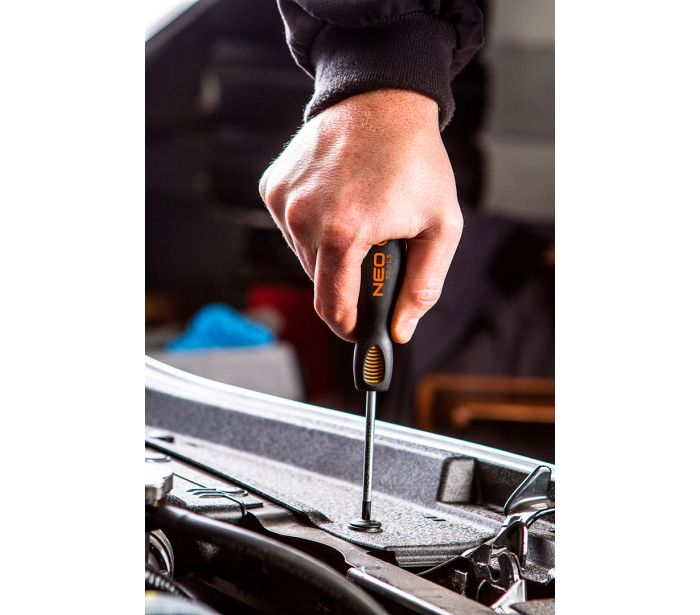 Zestaw wkrętaków NEO zawiera 7 wkrętaków: płaskie i krzyżowe. Grot wkrętaka wykonany jest z wyjątkowo wytrzymałej stali S2. Końcówka robocza grota została poddana obróbce cieplnej, dzięki czemu uzyskano odpowiednią twardość i odporność na zgięcia. Wkrętak posiada magnetyczną końcówkę. Trójgraniasty kształt uchwytu z wyprofilowanym oparciem dla kciuka zmniejsza obciążenie dłoni podczas pracy i ułatwia uzyskanie optymalnego momentu obrotowego. Uchwyt dwumateriałowy zapobiega ślizganiu się w dłoni, odporny jest na działanie chemikaliów, olejów i smarów. Jakość narzędzia potwierdzona 25-letnią gwarancją producenta. Marka NEO spełnia oczekiwania profesjonalistów.