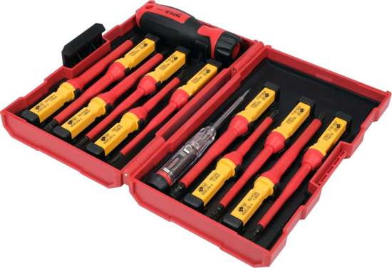 Zestaw wkrętaków izolowanych VDE w konfiguracji rękojeść + jedenaście wymiennych końcówek oraz jednobiegunowy próbnik elektryczny.