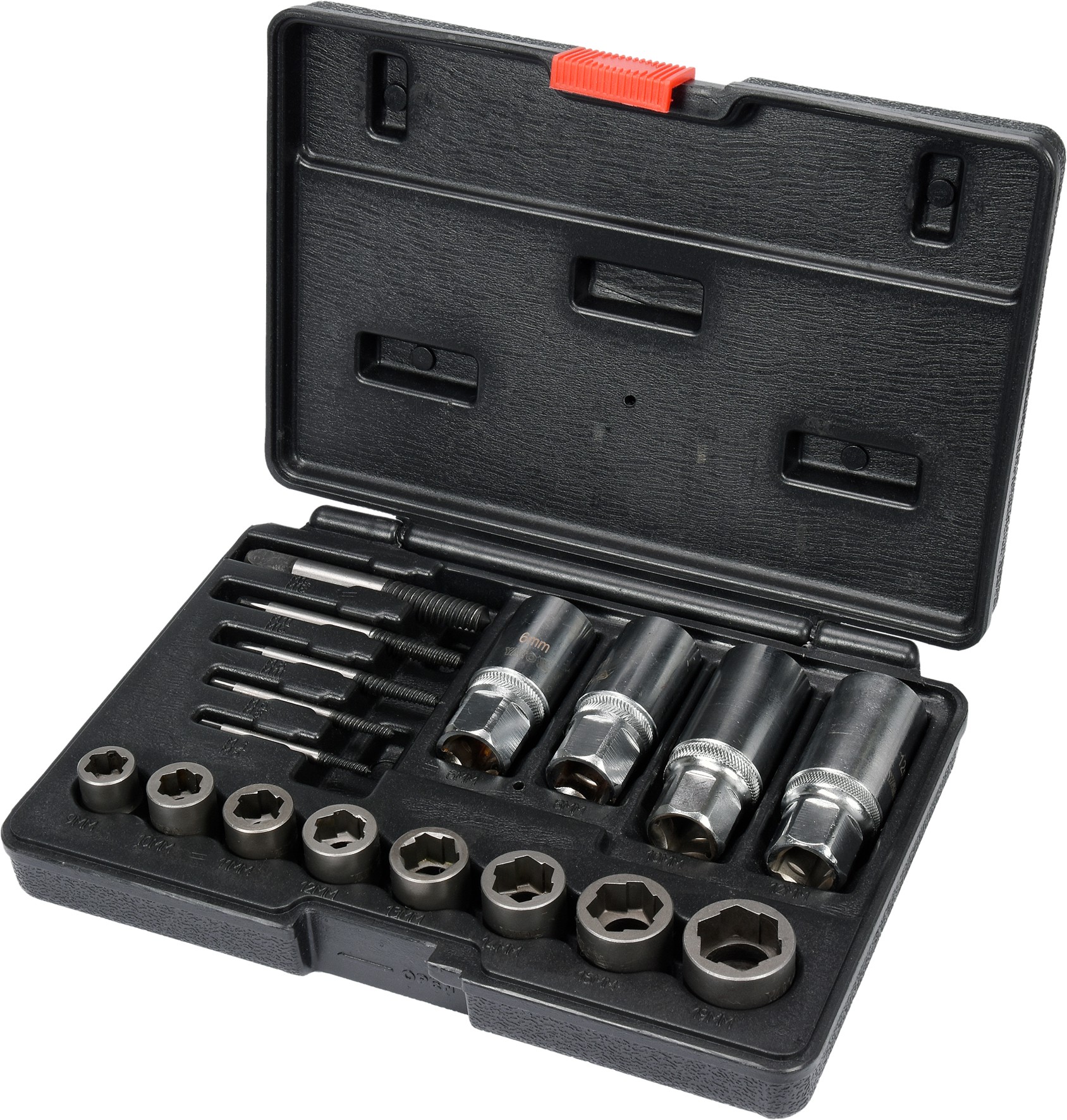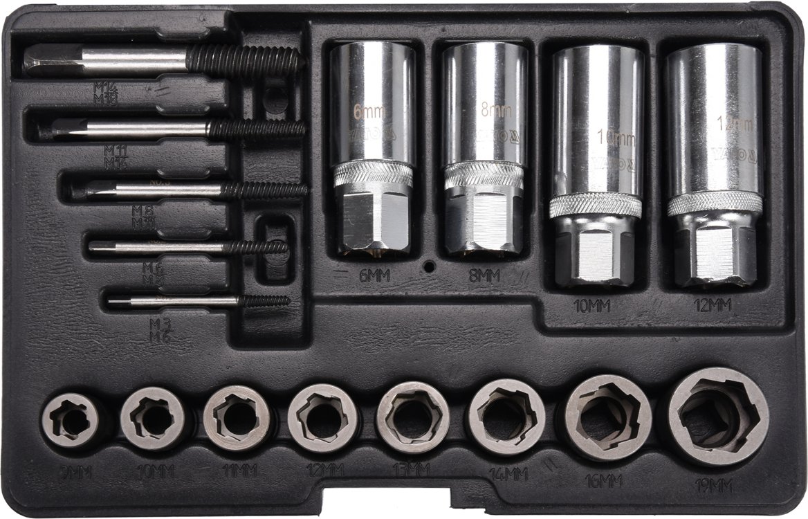 Uniwersalny 17-częściowy zestaw wykrętaków przeznaczonych do odkręcania śrub i nasadek.